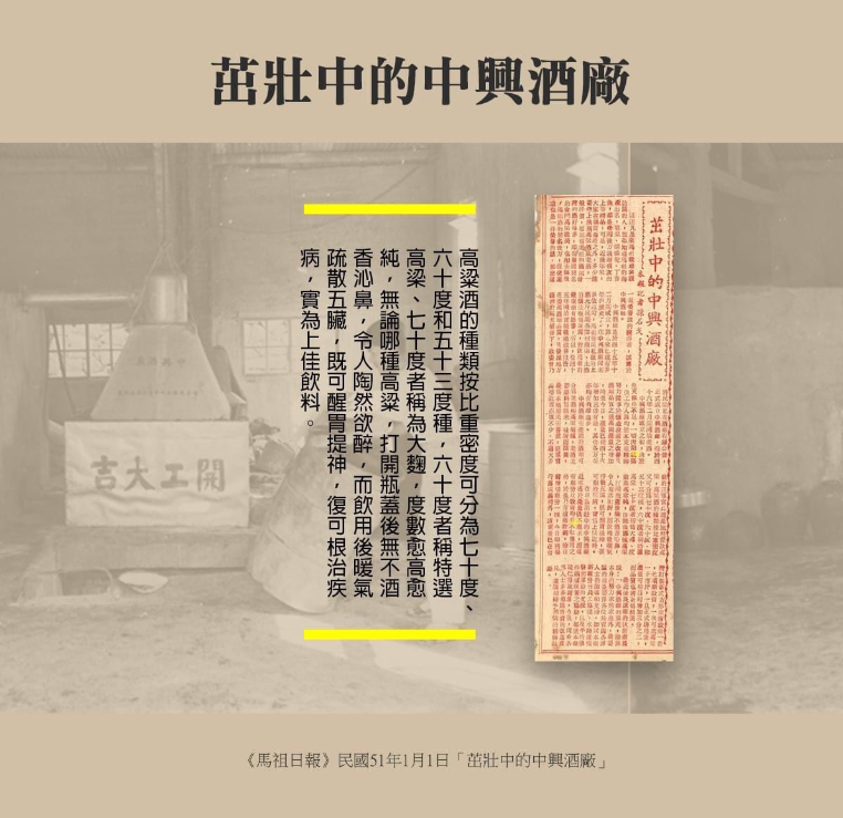 西元1956年3月,「馬祖戰地政務委員會」因應馬祖島上軍民之需,從部隊徵調來自四面八方釀酒人才,於馬祖牛角村創設「中興酒廠」為酒廠初名,並於1970年更名為馬祖酒廠,1992年馬祖解除戰地政務之後,馬祖酒廠改隸屬連江縣(馬祖)政府,於1999年改制為「馬祖酒廠實業股份有限公司」,為台灣三大公營酒廠之一。